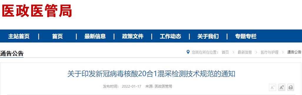 關(guān)于印發(fā)新冠病毒核酸20合1混采檢測技術(shù)規(guī)范的通知