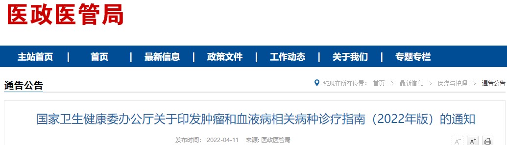 國家衛(wèi)生健康委辦公廳關于印發(fā)腫瘤和血液病相關病種診療指南(2022年版)的通知