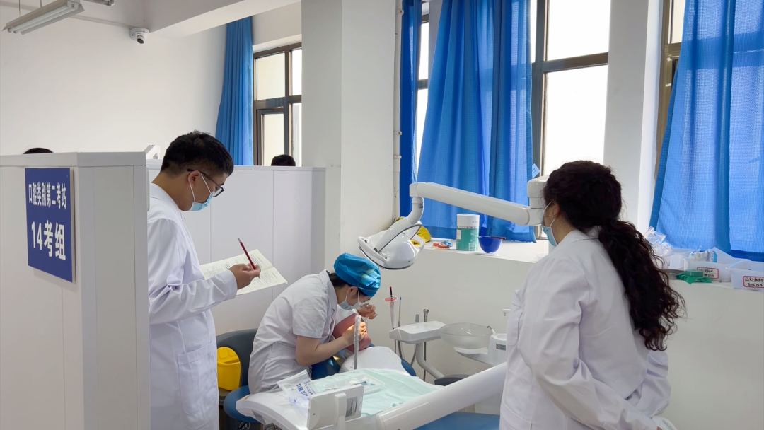 在口腔類別考試考場,記者看到,25臺考試專用牙椅安裝在地面上,考生們正兩兩配合,為對方做口腔檢查。在另一間考場,工作人員正在為假人替換假牙具?!斑@些設(shè)備都是嚴(yán)格按照考試標(biāo)準(zhǔn)配備的。所有的一次性耗材都會在考生使用后進(jìn)行封存,并更換新的供其他考生使用?!秉S贊說。