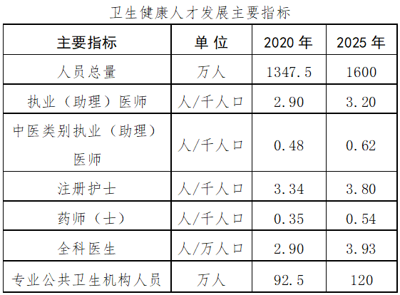 ——人才資源總量穩(wěn)步增長(zhǎng)。到2025年,衛(wèi)生健康人員總量達(dá)到1600萬人,每千人口執(zhí)業(yè)(助理)醫(yī)師數(shù)達(dá)到3.20人(其中中醫(yī)類別0.62人)、每千人口注冊(cè)護(hù)士數(shù)達(dá)到3.80人、每千人口藥師(士)數(shù)達(dá)到0.54人,每萬人口全科醫(yī)生數(shù)達(dá)到3.93人,專業(yè)公共衛(wèi)生機(jī)構(gòu)人員數(shù)增長(zhǎng)到120萬人。