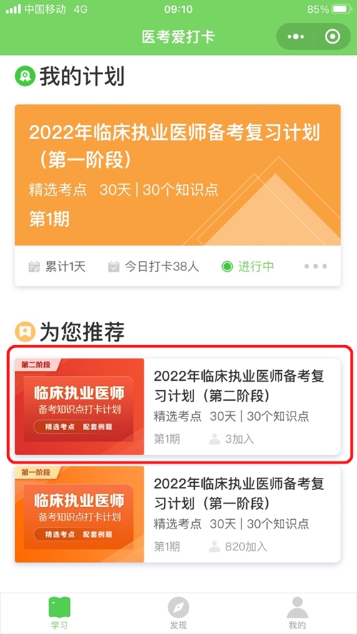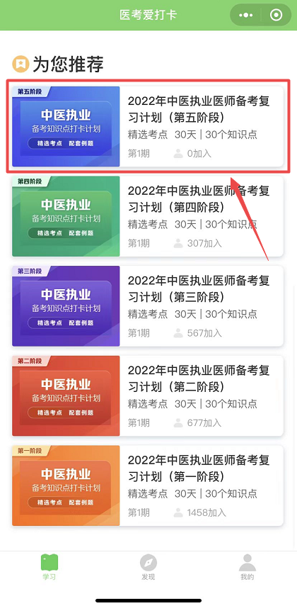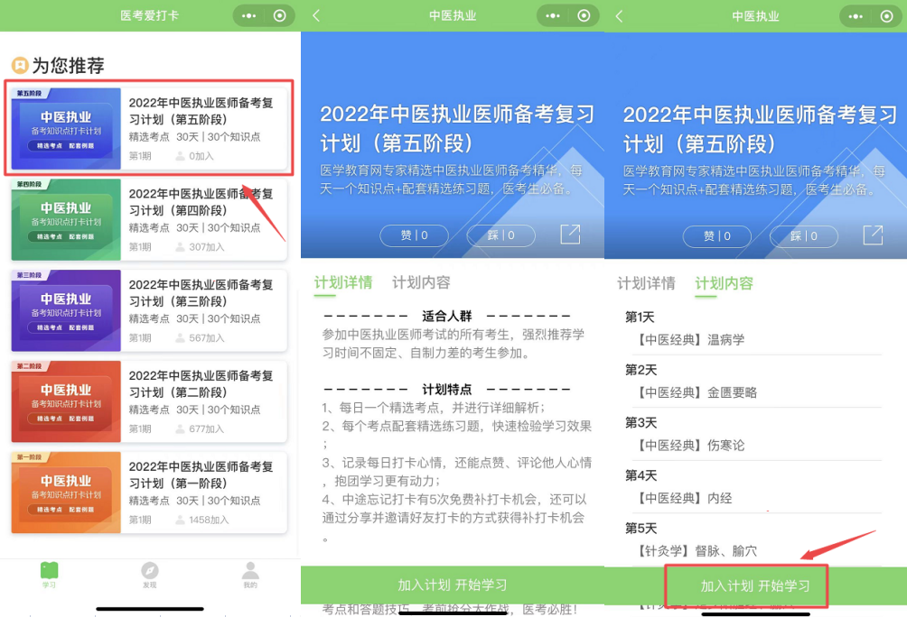 如中醫(yī)執(zhí)業(yè)醫(yī)師備考復(fù)習(xí)計劃(第五階段),然后點擊下方“加入計劃 開始學(xué)習(xí)”按鈕,開始正式進入打卡學(xué)習(xí)。