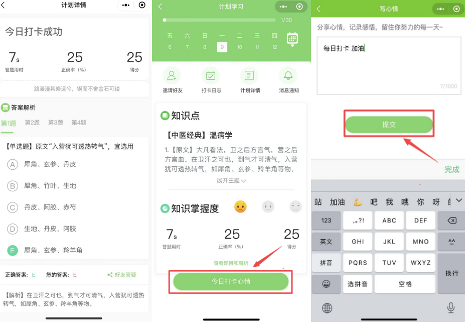 (3)查看測試結(jié)果+答案解析+分享今日打卡心情,提交完成打卡