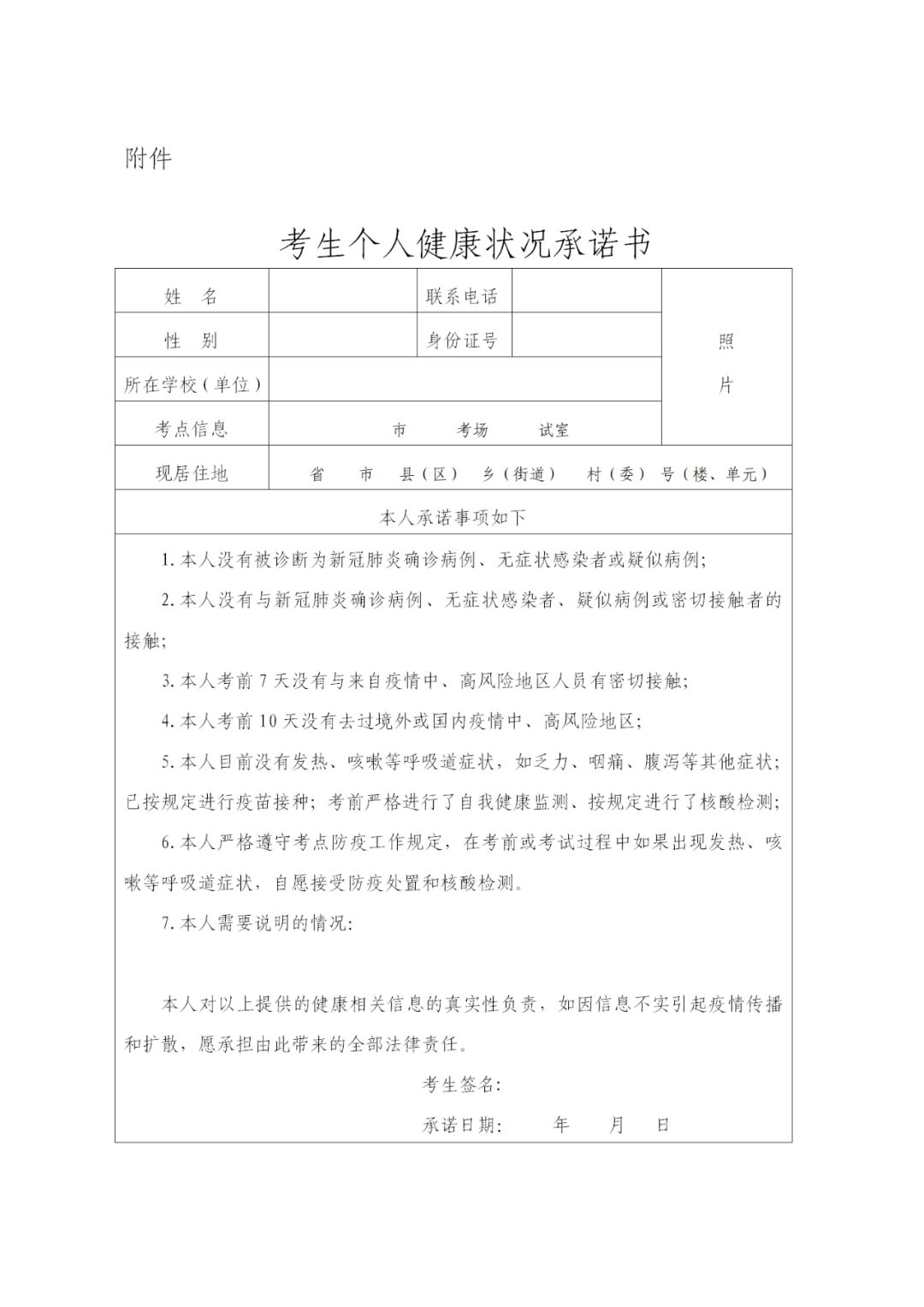 2.考生在考前10天內(nèi)應避免去中、高風險地區(qū)和人流密集的公共場所,并進行考前7天自我健康監(jiān)測,填寫《考生個人健康狀況承諾書》(見附件),承諾書作為考試當日入場憑證之一,進入考點時上交。