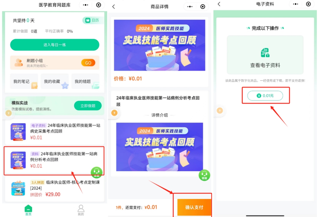 二、以臨床執(zhí)業(yè)醫(yī)師為例,選擇“臨床執(zhí)業(yè)醫(yī)師”,選擇“臨床執(zhí)業(yè)醫(yī)師技能第一站”商品,僅需0.01元即可獲取資料。