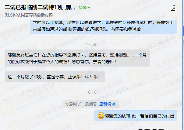 “感謝正保醫(yī)學(xué)教育網(wǎng)班主任!在您的指導(dǎo)下堅持打卡,堅持復(fù)習,堅持刷題.…一個月的挑燈夜戰(zhàn)終于換來今天的成績!感恩有你,親愛的老師!這一個月漲了30分,甚是驚喜,正保牛!牛!牛!"
