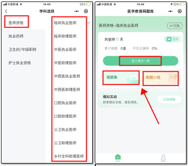 微信掃描上方二位碼,打開“正保醫(yī)學(xué)題庫(kù)”,下圖為首頁(yè),可以非常清晰的看到醫(yī)師資格下方有11個(gè)類別不同的學(xué)科選擇,您可以根據(jù)刷題時(shí)間安排,可以在等飯或者地鐵上打開每日一練,也可以在周末時(shí)間充足的時(shí)候來(lái)一次模擬實(shí)戰(zhàn),或者在睡前打開我的錯(cuò)題再來(lái)一遍查漏補(bǔ)缺,更有刷題小組等你組隊(duì),一起問(wèn)鼎爭(zhēng)霸!