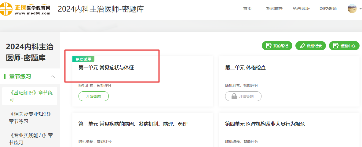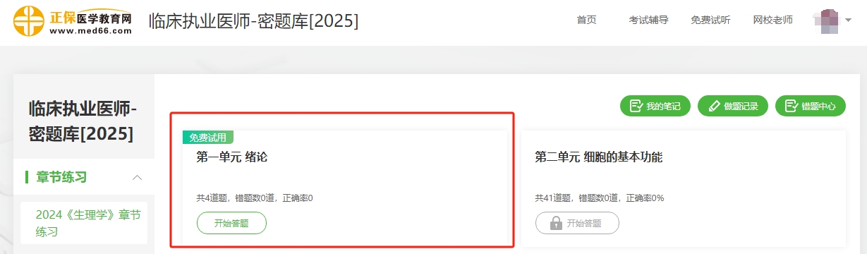 示例:例如選擇【臨床執(zhí)業(yè)】科目-【章節(jié)練習(xí)】-【《生理學(xué)》章節(jié)練習(xí)】-【第一單元緒論】已開通免費(fèi)試用供大家體驗(yàn)。