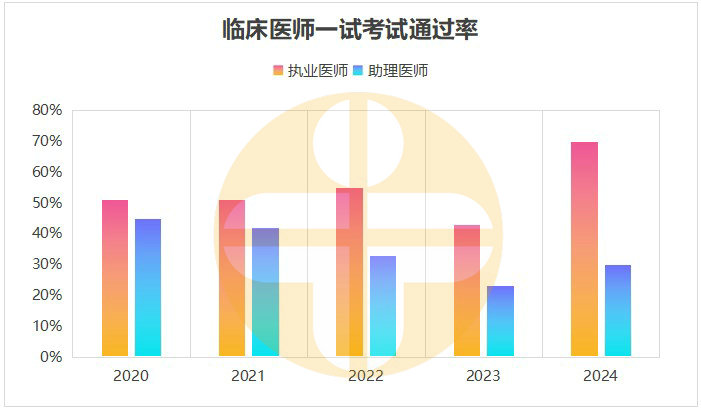 臨床執(zhí)業(yè)醫(yī)師一試筆試的通過率前3年比較穩(wěn)定,在50%左右,2023年降到了43%,2024年通過率驟增,60~80%;臨床助理醫(yī)師筆試通過率呈逐年下降趨勢,2024年有所抬頭、增漲。