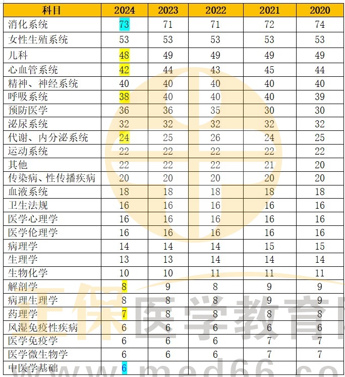 2.預防醫(yī)學增加了6分,中醫(yī)學基礎6分,其他增加了1分;像消化、女性、心血管、呼吸、泌尿、內分泌、生理學、藥理學這些科目減少了1~2分;兒科疾病減少了3分。其余科目無變動。