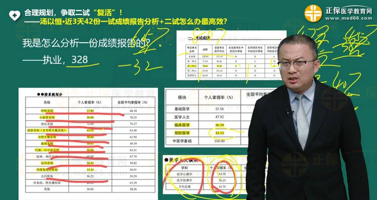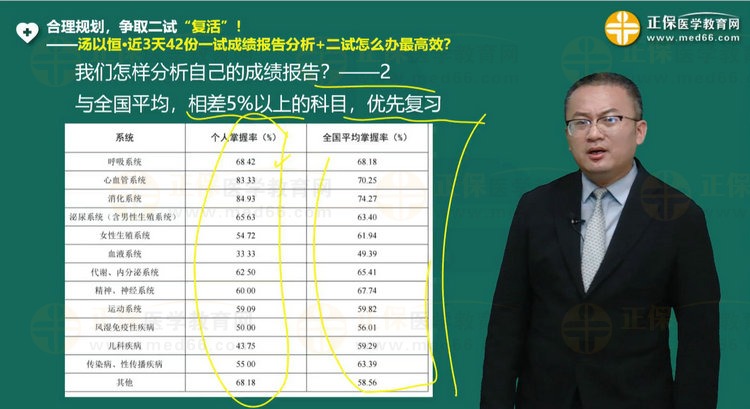 另外,大家除了要看自己哪部分低于全國(guó)平均掌握率之外,還要看自己欠缺的部分哪些是分值占比高的,正保醫(yī)學(xué)|教育網(wǎng)哪些是分值占比低的。在二試沖刺時(shí)間有限的情況下,我們肯定是要選擇性價(jià)比高的科目進(jìn)行針對(duì)集中攻克。哪個(gè)提分快,我們二試沖刺就主攻這個(gè)。