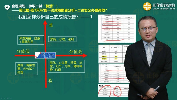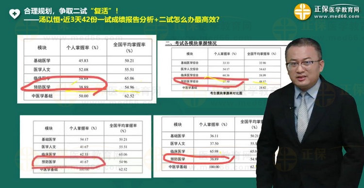 大家拿到一試成績(jī)報(bào)告后,要學(xué)會(huì)自行分析。首先大家常見(jiàn)的誤區(qū)就是,哪個(gè)分?jǐn)?shù)線就只學(xué)哪個(gè)部分,這是絕對(duì)錯(cuò)誤的!要根據(jù)你的掌握率跟全國(guó)平均情況對(duì)比來(lái)看,舉例來(lái)說(shuō),從目前搜集到的學(xué)員成績(jī)報(bào)告來(lái)看,預(yù)防醫(yī)學(xué)就是大家普遍忽略的點(diǎn)。