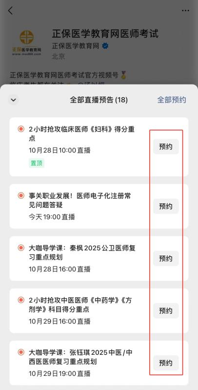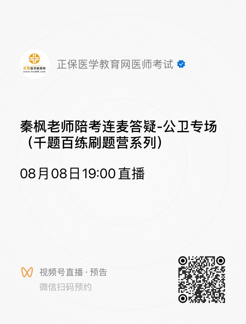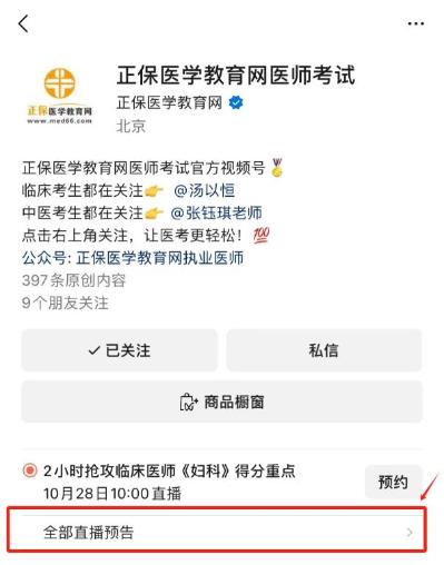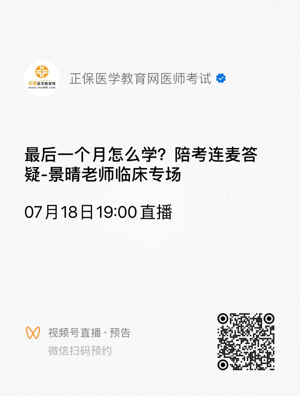關(guān)注微信視頻號(hào)"正保醫(yī)學(xué)教育網(wǎng)醫(yī)師考試",可以直接點(diǎn)擊預(yù)約直播。直播當(dāng)天會(huì)收到開(kāi)播提醒。