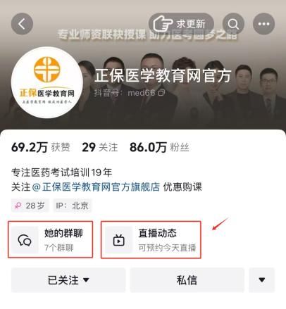 關(guān)注抖音號(hào)"正保醫(yī)學(xué)教育網(wǎng)官方",添加關(guān)注后可以在賬號(hào)主頁(yè)進(jìn)入粉絲群。直播當(dāng)天會(huì)收到開(kāi)播提醒。