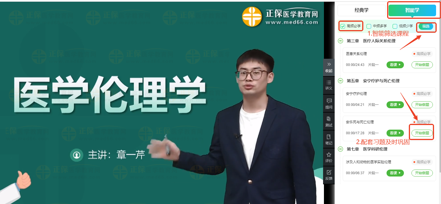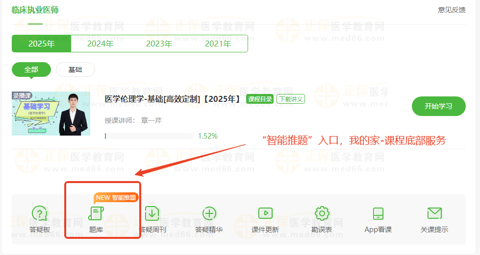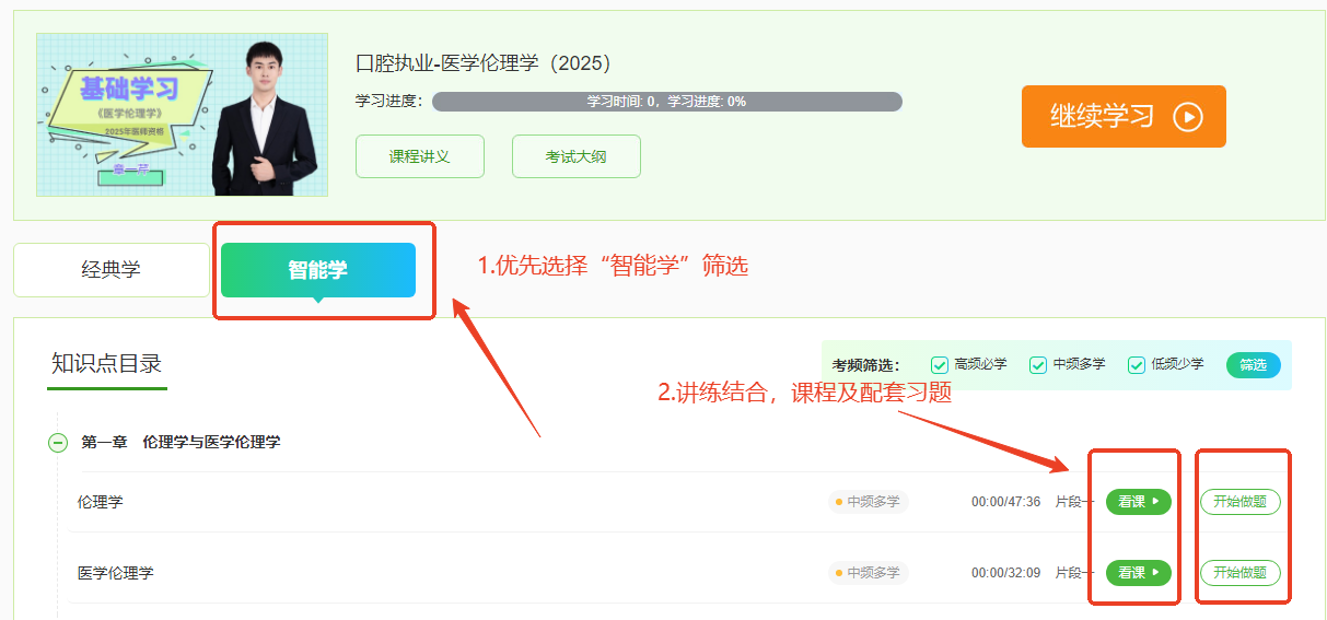 在備戰(zhàn)醫(yī)師考試的道路上,每一位醫(yī)學(xué)生都渴望找到一條既高效又精準的學(xué)習(xí)路徑。正保醫(yī)學(xué)教育網(wǎng)2025年醫(yī)師資格輔導(dǎo)課程重磅升級!新增“智能學(xué)”和“智能推題”兩大功能,通過大數(shù)據(jù)智能分析歷年考試中知識點的考頻概率,結(jié)合專業(yè)老師多年授課經(jīng)驗以及網(wǎng)校教研團隊長期教學(xué)實踐經(jīng)驗綜合判定,學(xué)員可以按需選擇高頻考點優(yōu)先學(xué)習(xí),搭配配套習(xí)題,備考更精準!