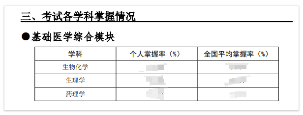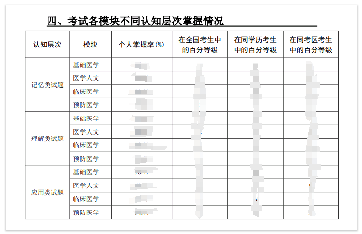 報(bào)告的內(nèi)容包括總成績、各模塊、學(xué)科及認(rèn)知層次的掌握率和百分等級(jí),樣例見附件 (以臨床為例)。其中個(gè)人成績分析數(shù)據(jù)以四個(gè)單元成績?yōu)榛A(chǔ),不包括軍事醫(yī)學(xué)及短線醫(yī)學(xué)專業(yè)加試成績的數(shù)據(jù)分析??忌筛鶕?jù)報(bào)告內(nèi)容了解自己的各分析維度在全國考生或同類考生中的相對(duì)位置,輔助評(píng)估薄弱模塊、學(xué)科等內(nèi)容,為日后的學(xué)習(xí)、提升提供科學(xué)依據(jù)。