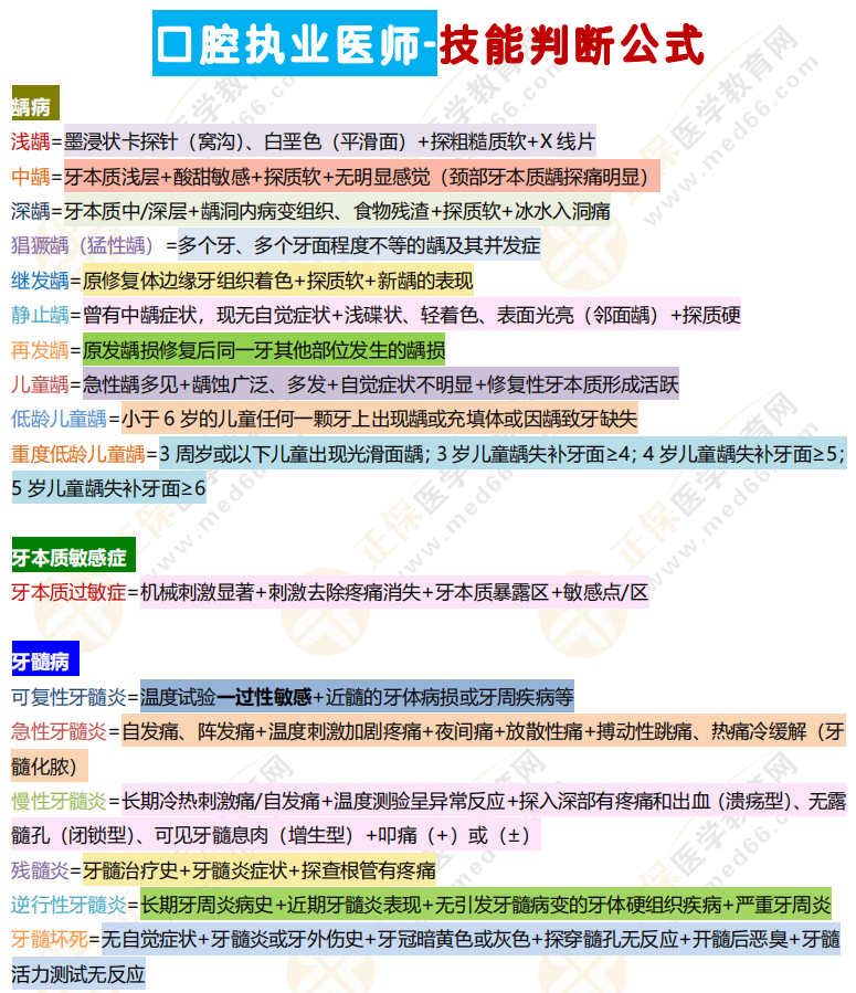 《口腔醫(yī)師技能判斷公式多色筆記》通過多色標注,清晰地展示了各類疾病的判斷公式和操作要點,幫助考生快速掌握關鍵知識點。