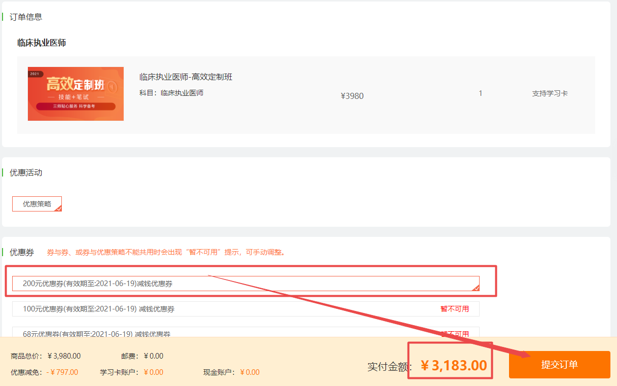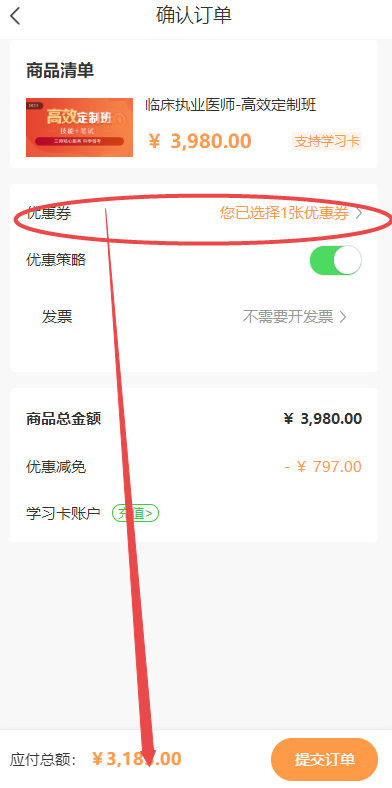 第三步、選擇優(yōu)惠券后點擊提交訂單即可