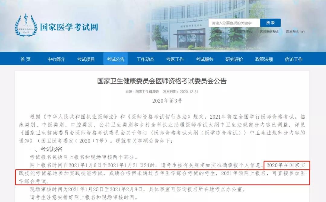 2020年在國(guó)家實(shí)踐技能考試基地參加實(shí)踐技能考試,成績(jī)合格但未通過當(dāng)年醫(yī)學(xué)綜合考試的考生,2021年須網(wǎng)上報(bào)名,可直接參加醫(yī)學(xué)綜合考試。