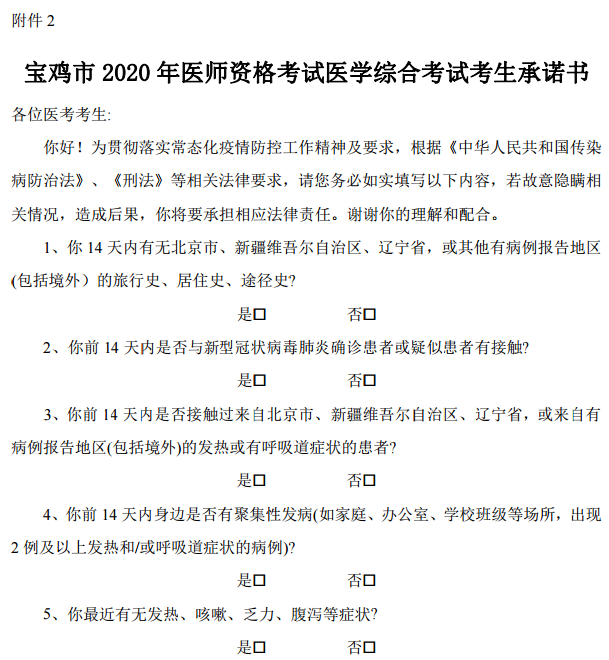 2.寶雞市2020年醫(yī)師資格考試醫(yī)學(xué)綜合考試考生承諾書