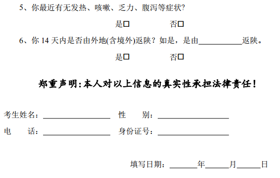 (三)外地來陜返陜考生,必須提供考前3天內(nèi)由本省三級(jí)醫(yī)療機(jī)構(gòu)或指定第三方檢測(cè)機(jī)構(gòu)出具的核酸檢測(cè)健康證明。