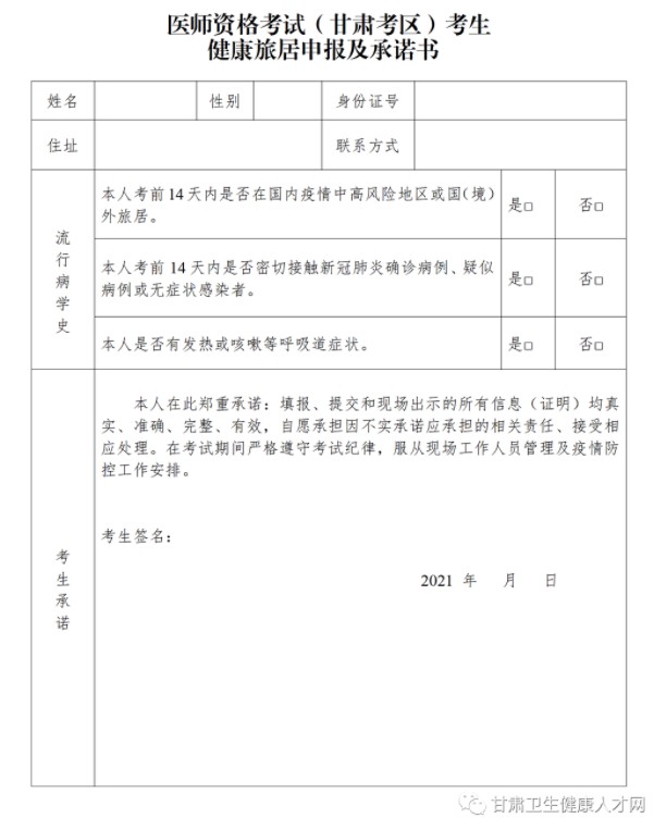 5.考生應(yīng)于6月10日前從“甘肅省衛(wèi)生健康委員會(huì)”官網(wǎng)下載《醫(yī)師資格考試(甘肅考區(qū))考生健康旅居申報(bào)及承諾書(shū)》,如實(shí)填寫(xiě)相關(guān)信息,凡隱瞞或謊報(bào)旅居史、接觸史、健康狀況等,不配合工作人員進(jìn)行防疫檢測(cè)、詢問(wèn)、排查、送診等造成嚴(yán)重后果的,將依法依規(guī)進(jìn)行處理。
