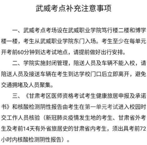 從疫情中高風險區(qū)來甘人員,要嚴格按照甘肅省疫情防控要求落實管控措施。因疫情防控形勢需要,各考點根據(jù)實際情況,均制定了不同的防控措施,考生需嚴格遵守當?shù)赜嘘P(guān)規(guī)定。甘肅省各市州最新疫情防控要求,請咨詢甘肅省各市州衛(wèi)生健康委員會。
