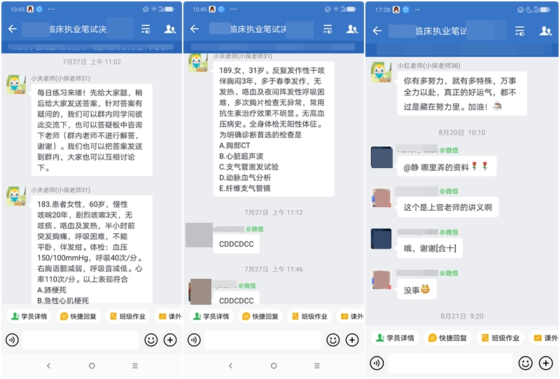 “每日一練”由班主任老師發(fā)放給學(xué)員練習(xí)鞏固,微信群內(nèi)做題,同班同學(xué)互相監(jiān)督,一起討論交流,2022年醫(yī)師資格考試復(fù)習(xí),你不再是孤軍奮戰(zhàn)!