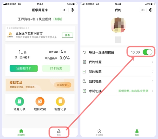 想要每天堅持打卡,但是一忙起來總忘?想要督促自己每日必須完成打卡內(nèi)容?點擊“我的”,打開“每日一練通知提醒”就可以解決啦!考生可以根據(jù)自己的工作休息時間自行設(shè)置打卡提醒時間。