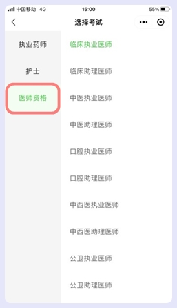 2、選擇“醫(yī)師資格”類別進(jìn)入各類別醫(yī)師考試題庫,涵蓋臨床執(zhí)業(yè)、臨床助理、中醫(yī)執(zhí)業(yè)、中醫(yī)助理、口腔執(zhí)業(yè)、口腔助理、中西醫(yī)執(zhí)業(yè)、中西醫(yī)助理、公衛(wèi)執(zhí)業(yè)、公衛(wèi)助理、鄉(xiāng)村全科助理醫(yī)師。