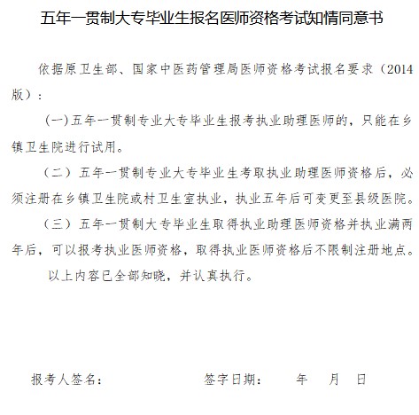 附件下載:五年一貫制大專畢業(yè)生報名醫(yī)師資格考試知情同意書