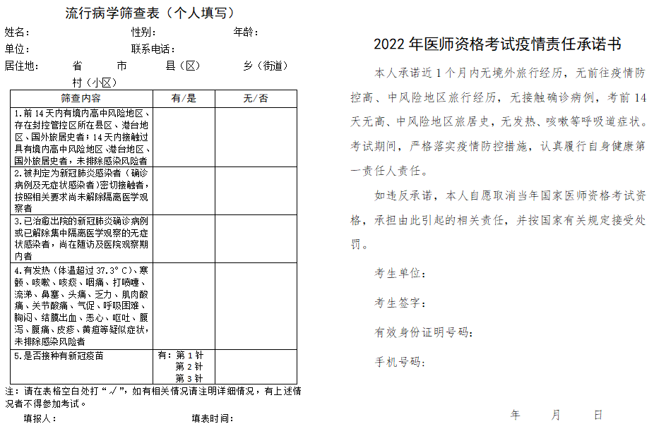 漯河考點流行病學篩查表和2022年醫(yī)師資格考試疫情責任承諾書