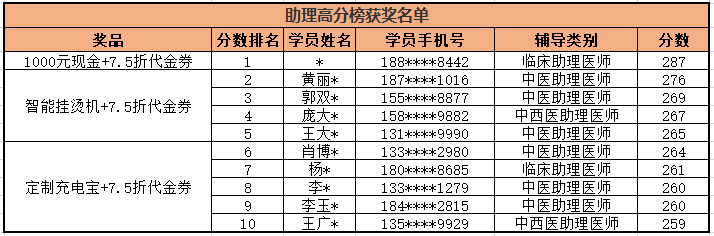 | 助理醫(yī)師高分榜 | 第1名 | 現(xiàn)金1000元+7.5折代金券 |