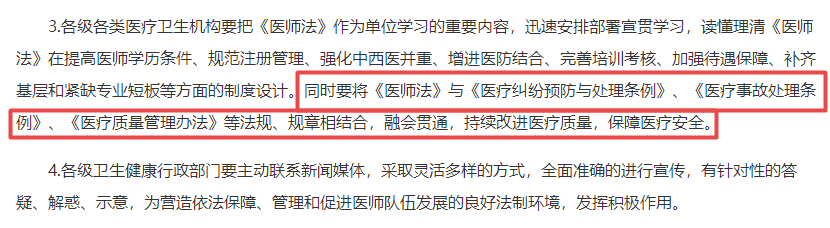 2.各級衛(wèi)生健康行政部門要采取集中培訓、座談討論等多種形式,組織學習培訓宣傳,抓緊抓實全員培訓,讓全行業(yè)和相關(guān)機構(gòu)人員都深刻理解法律的各項規(guī)定,進一步增強法制觀念和法制素養(yǎng)。將《醫(yī)師法》的各項要求運用到工作實踐中,不斷提高依法管理醫(yī)師隊伍的能力,不斷提高履行法律義務的自覺。
