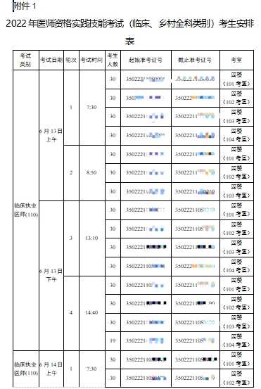 福州考點2022年醫(yī)師實踐技能考試(臨床、鄉(xiāng)村全科類別)考生安排表