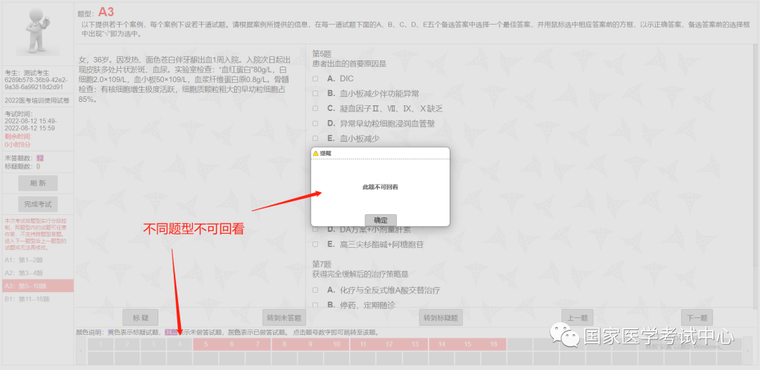 為加強考試管理,維護考試公平,計算機化考試“跨題型不可回看”。醫(yī)師資格考試綜合考試試卷包括A1 、A2、A3/A4和B1四種題型。今年起,考生須完成同一題型內(nèi)全部試題作答后,方可進入下一題型。進入下一題型答題時,上一題型做答情況不能回看。