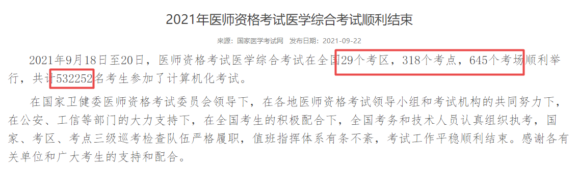 2021年9月18日至20日,醫(yī)師資格考試醫(yī)學(xué)綜合考試在全國29個考區(qū),318個考點,645個考場順利舉行,共計532252名考生參加了計算機化考試。