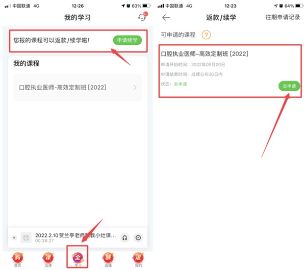 2022年醫(yī)師資格輔導(dǎo)課程續(xù)學(xué)申請(qǐng)開(kāi)通流程(APP端)