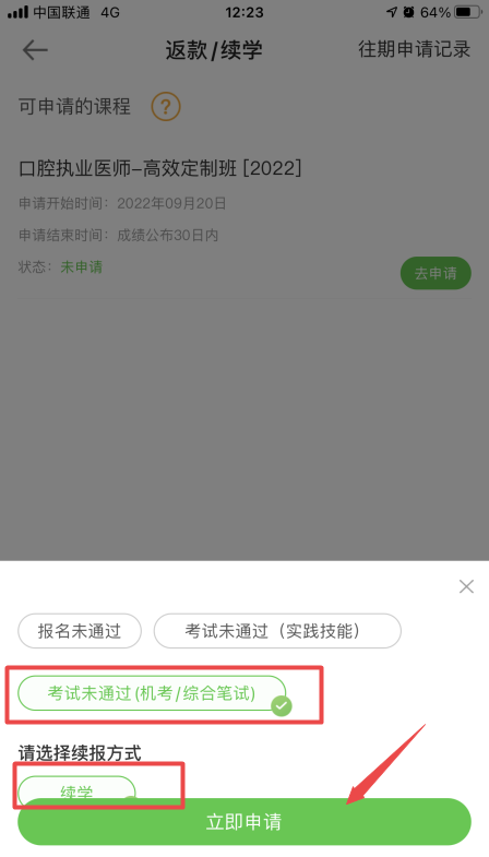 例如:醫(yī)師綜合考試未通過(guò),可勾選【考試未通過(guò)(綜合筆試/機(jī)考)】—【續(xù)學(xué)】—【立即申請(qǐng)】。