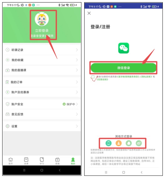 1.學員進入醫(yī)學教育網APP中,點擊下方【我的】按鈕定位到登陸頁面,您可以選擇微信方式直接登陸,也可以選擇用手機號登陸;如您之前未注冊過醫(yī)學教育網賬號,直接按頁面提示進行注冊即可。