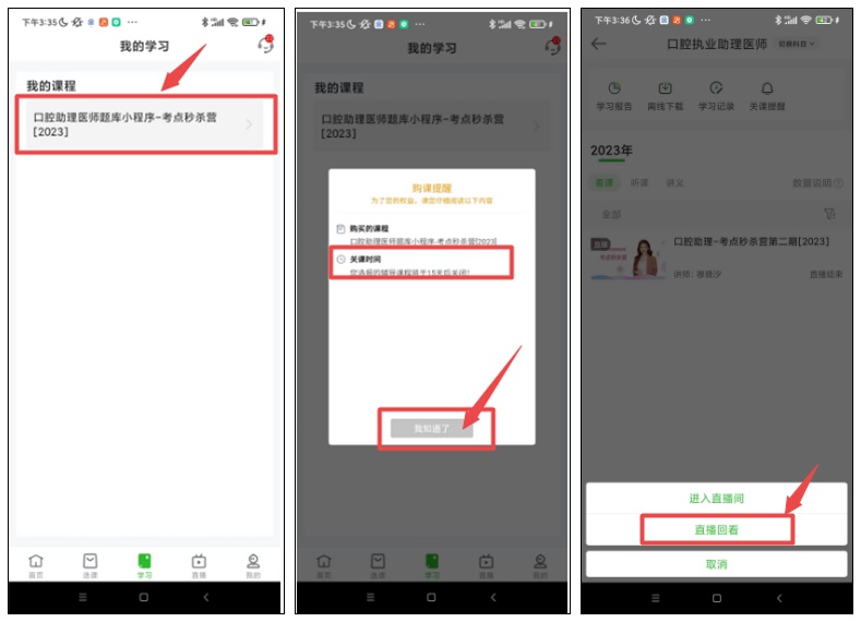 2.登陸成功后,點擊下方【學習】按鈕定位到我的課程頁面,就直接可以看到自己在題庫小程序中購買的課程了,點擊自己想要學習的課程,就會進一步提醒,按照步驟查看課程就可以開始學習了。