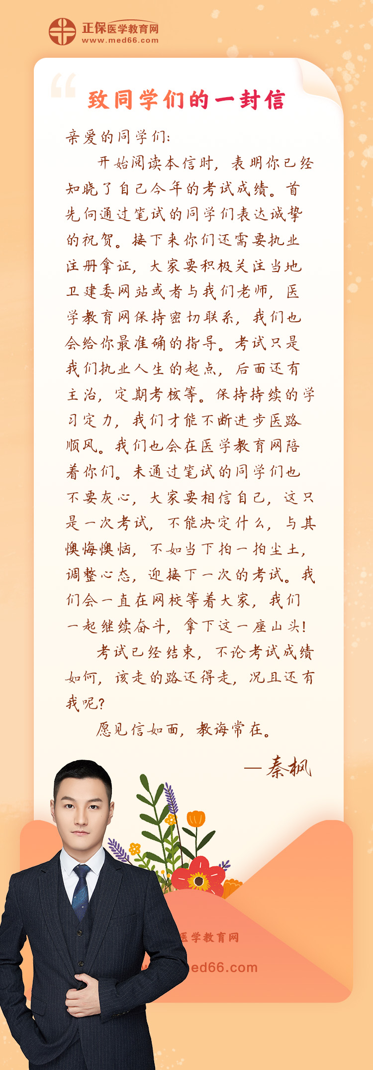 2023年醫(yī)師資格考試成績查詢?nèi)肟?/a>開通(快速查分>>)后,醫(yī)學(xué)教育網(wǎng)在這里恭喜各位考生順利通過考試!同時(shí)老師們也在心心念念著各位同學(xué),紛紛為大家送上了“祝福和囑托”,快來看看秦楓老師都對我們說了哪些內(nèi)容: