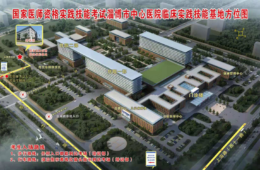 自行駕車前往:自行駕車前往考生需從淄博市中心醫(yī)院西院區(qū)南門(新村路上,住院二部入口)進入考試基地,并停在指定停車場,步行前往培訓(xùn)樓,其他入口與培訓(xùn)樓道路不相通。