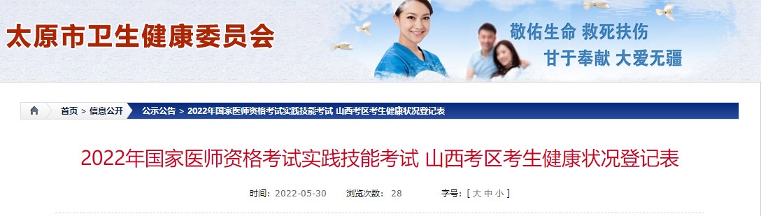 關(guān)于2022年國家醫(yī)師資格考試實踐技能考試山西考區(qū)考生健康狀況登記表的相關(guān)通知,醫(yī)學(xué)教育網(wǎng)編輯為您整理了以下相關(guān)信息,具體內(nèi)容如下,希望可以對您有所幫助: