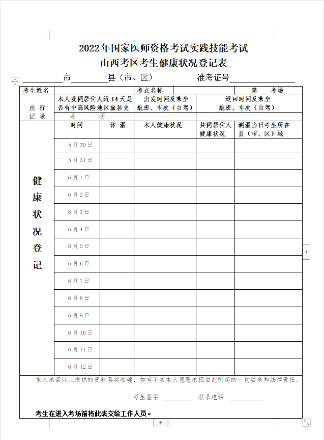 2022年國家醫(yī)師資格考試實踐技能考試山西考區(qū)考生健康狀況登記表