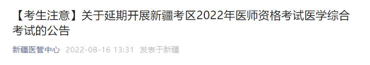 關于延期開展新疆考區(qū)2022年醫(yī)師資格考試醫(yī)學綜合考試的公告