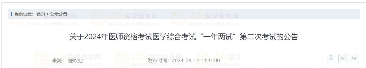 關(guān)于2024年醫(yī)師資格考試醫(yī)學(xué)綜合考試“一年兩試”第二次考試的公告已發(fā)布,二試網(wǎng)上報(bào)名時(shí)間從2024年9月18日0時(shí)起至9月24日24時(shí)。醫(yī)學(xué)教育網(wǎng)小編為大家整理如下內(nèi)容: