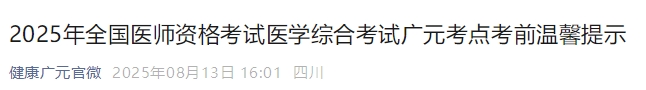 2025年全國醫(yī)師資格考試醫(yī)學綜合考試廣元考點考前溫馨提示公布啦!請相關考生及時查看,提前做好應試準備!