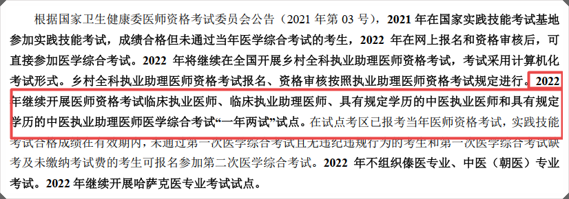 2022年繼續(xù)開展醫(yī)師資格考試臨床執(zhí)業(yè)醫(yī)師、臨床執(zhí)業(yè)助理醫(yī)師、具有規(guī)定學(xué)歷的中醫(yī)執(zhí)業(yè)醫(yī)師和具有規(guī)定學(xué)歷的中醫(yī)執(zhí)業(yè)助理醫(yī)師醫(yī)學(xué)綜合考試“一年兩試”試點(diǎn)。