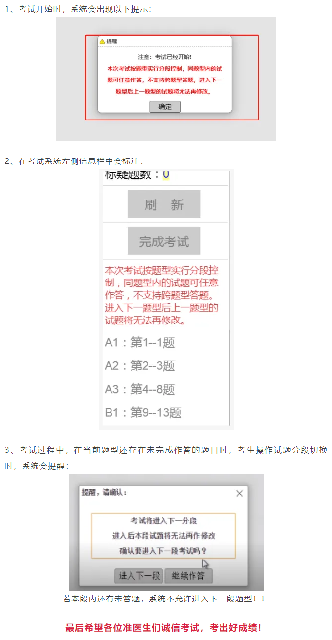 醫(yī)師資格考試計(jì)算機(jī)化考試系統(tǒng)對(duì)“分段控制”功能進(jìn)行了優(yōu)化升級(jí)。以題型進(jìn)行分段(如:A1、A2、A3/A4、B1),考生必須完成同一題型內(nèi)全部試題作答后,方可進(jìn)入下一題型。