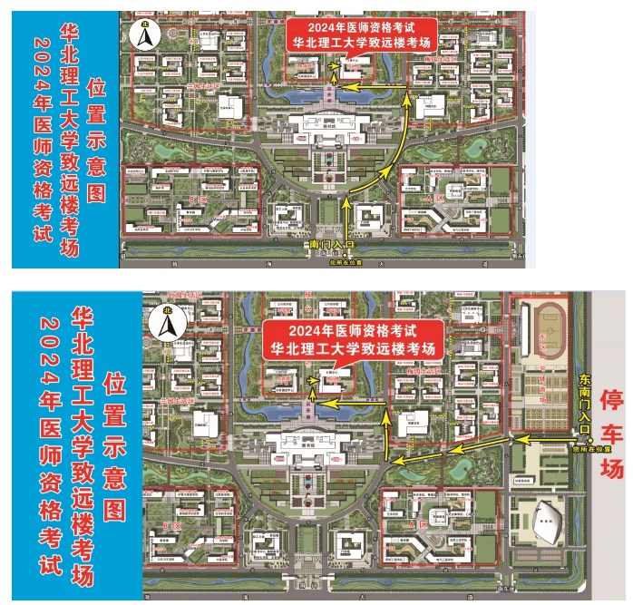 1.華北理工大學(xué)致遠(yuǎn)樓考場對考生開放兩個(gè)進(jìn)校門口。渤海大道上的學(xué)校南門考生步行進(jìn)校,開車來的考生經(jīng)學(xué)校南門繼續(xù)向前直行900米,再向北轉(zhuǎn)直行500米到達(dá)停車場,停車后步行經(jīng)東南門進(jìn)校。